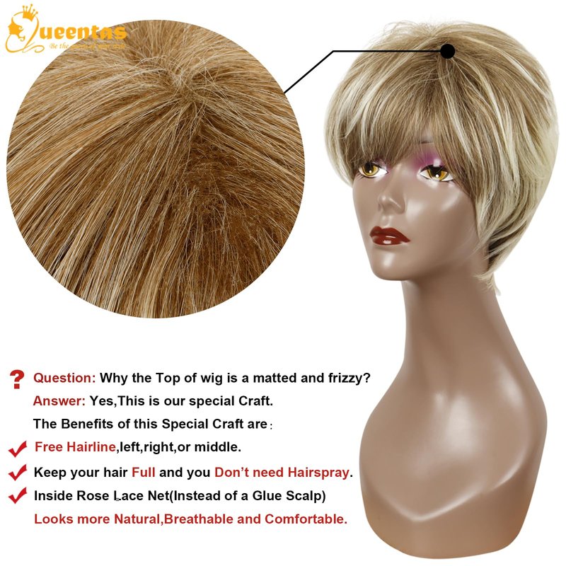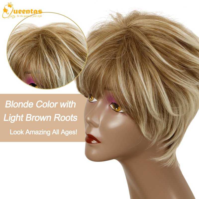 QUEENTAS Pixie Layered Short Blonde Wigs for White Women Black Women Synthetic Hair (Blonde Mixed Brown)