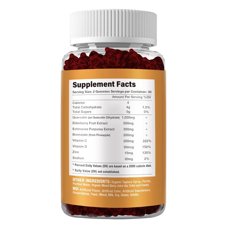 - Enhanced Absorption - Our unique combination of quercetin, zinc, bromelain, elderberry, and vitamin C gummies ensures high bioavailability, making them easily absorbed by your body. Say goodbye to the hassle of swallowing numerous capsules after each meal.