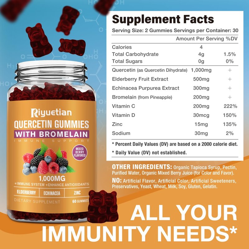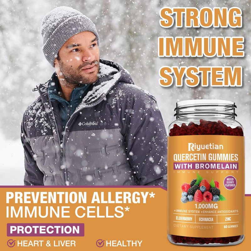 - 10 IN 1 Immune Support Quercetin Gummies - An immunity vitamin supplement like none other. Quercetin, Zinc, Vitamin C, and Elderberry for Adults and Kids all in one mouth watering gummy. Our Quercitine is packed with over 1000mg per serving,which boost heart & cardiovascular health, support respiratory function, promote a well-balanced immune system, support gut health strengthen antioxidants,build strong muscles & joints, and nourish skin & anti-aging.