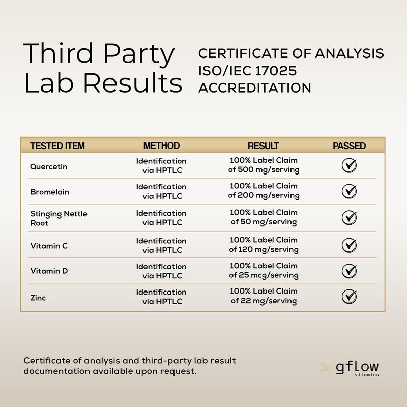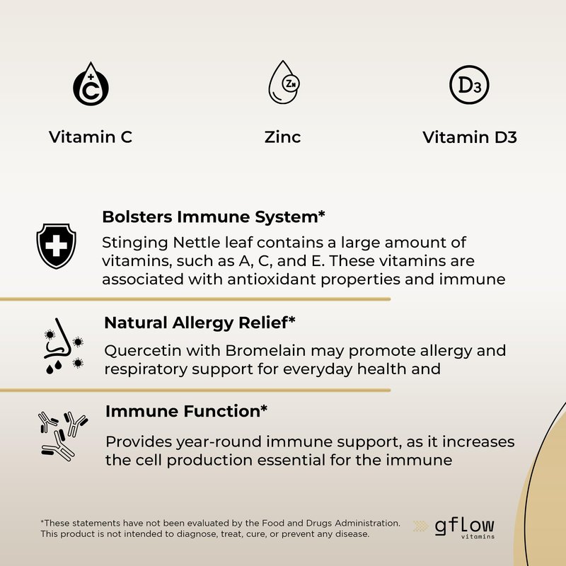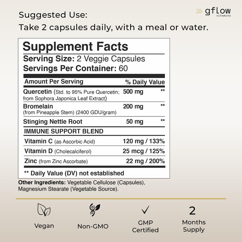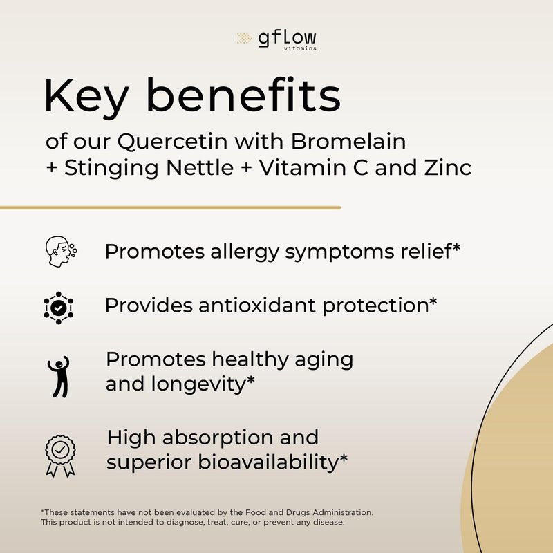 - A POWERFUL COMBINATION TO BOOST THE IMMUNE SYSTEM: Quercetin is a plant pigment naturally found in fruits and vegetables. Gflow Quercetin with Bromelain has also vitamin C, Zinc, and Vitamin D3, as well as stinging nettle root. Stinging nettle capsules work together with the other ingredients to help the body absorb the quercetin more effectively. It's a great substitute for quercetin powder, quercetin gummies, bromelain powder, zinc supplements, vitamin c gummies, vitamin d gummies.*