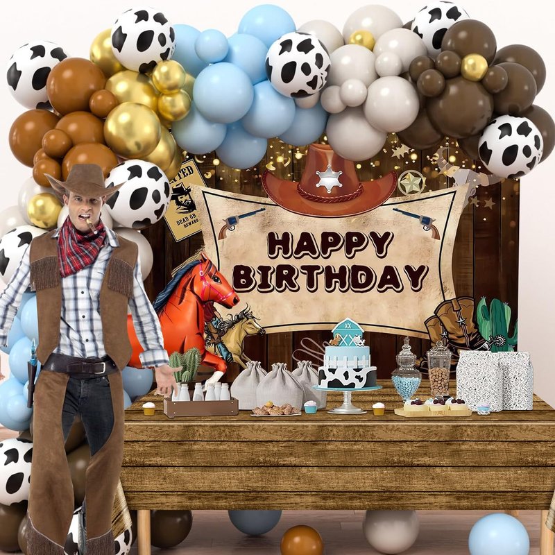 - Western Theme Design: Interesting western birthday party table covers are designed with west wooden house rustic barn door elements, all of these can add a more vintage western themed atmosphere to your party