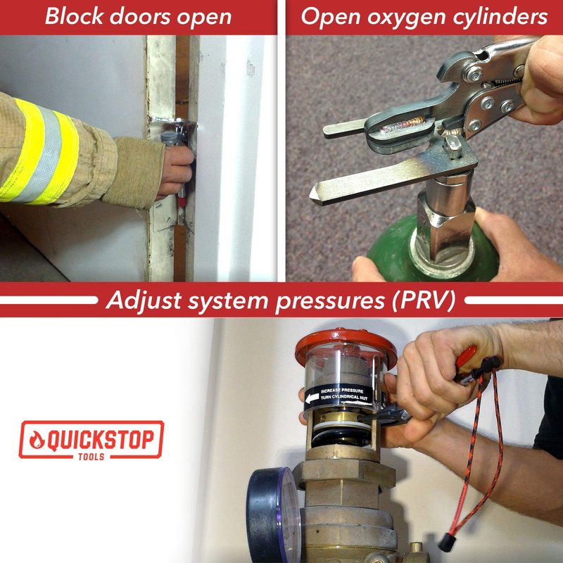 - INDISPENSABLE TOOL TO HAVE AT HOME OR OFFICE: Quickstop Multi-Tool is the FIRST AND ONLY multi-use fire sprinkler shutoff tool that gives firefighters 7 different tools they need to manage commercial and high-rise fires. The tool can be used to 1) stop fire sprinklers 2) remove FDC caps 3) make standpipe connections 4) shut off residential utilities 5) adjust system pressures (PRV) 6) open oxygen cylinders, and 7) block doors open