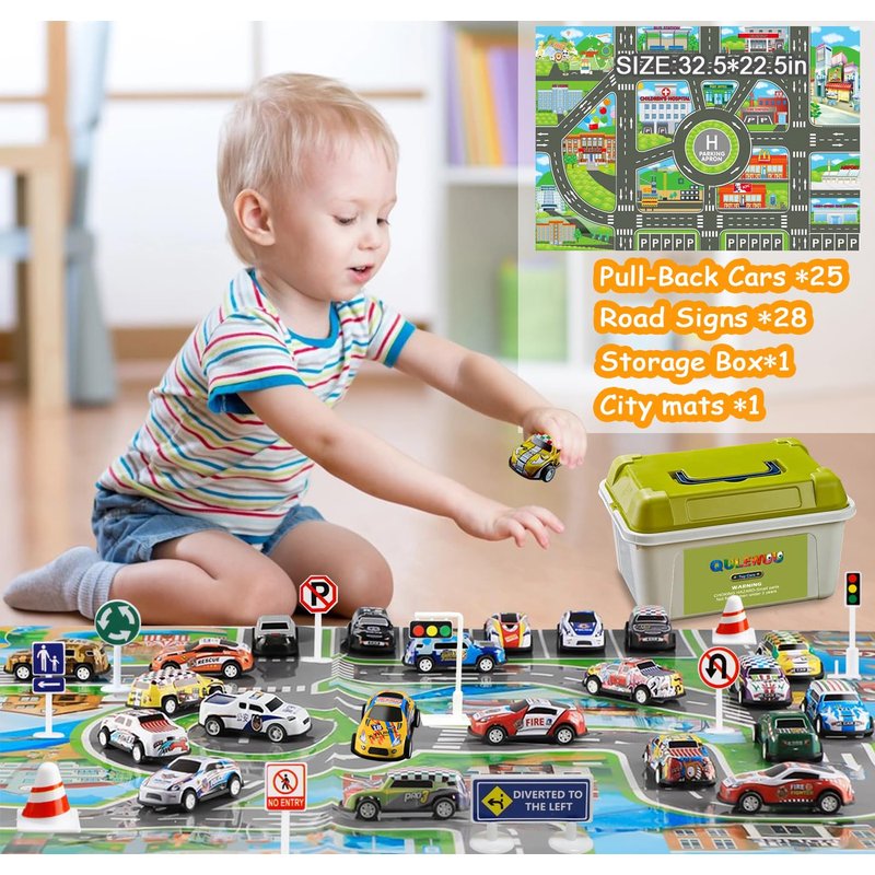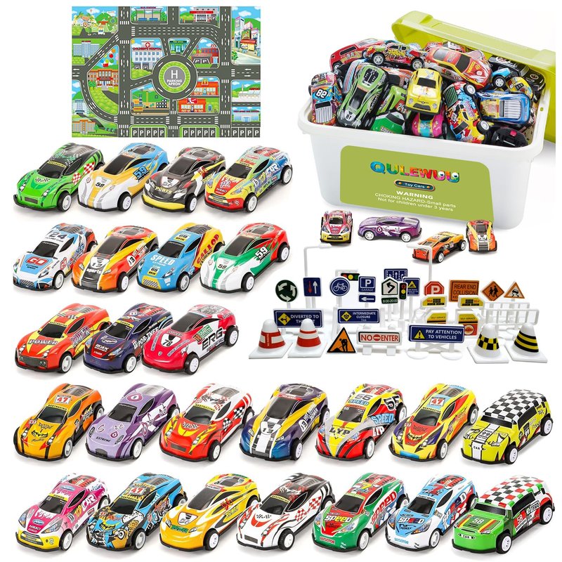 QULEWUU Funny Little Metal Pull Back Toy Car Set for Kids Ages 3-8, 25 Pcs Toy Cars and 28 Pcs Road Signs, Ideal Gift for Toddlers Birthday
