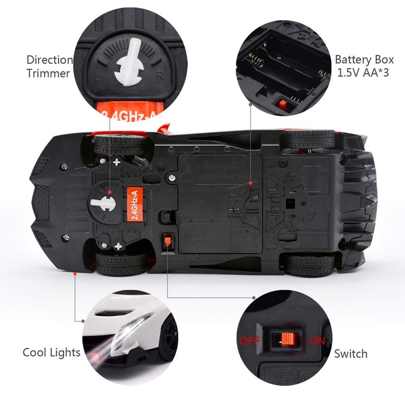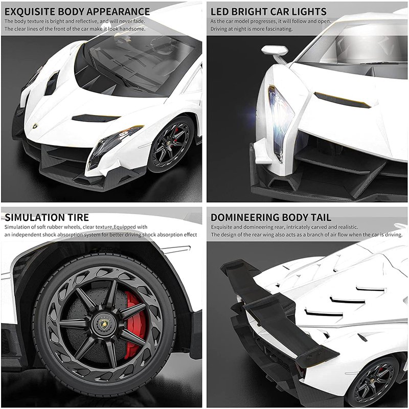 QUN FENG Upgrated Lamborghini Veneno rc car. Its frequency is up to 2.4G,which make 2 cars racing togther possible.The rc car also builted in a detail of the car seats and wheel inside and a see through window.Three different colors for your options, elegant red, shinny yellow and cool white. These remote control cars are wonderful gifts for kids.