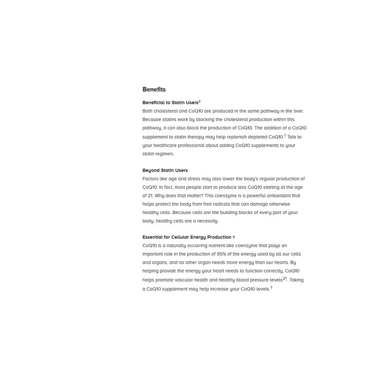 - ESSENTIAL FOR ENERGY PRODUCTION: CoQ10 plays a vital role in the production of energy in the body. Taking a CoQ10 supplement helps increase natural CoQ10 levels that can be depleted by age and medications
