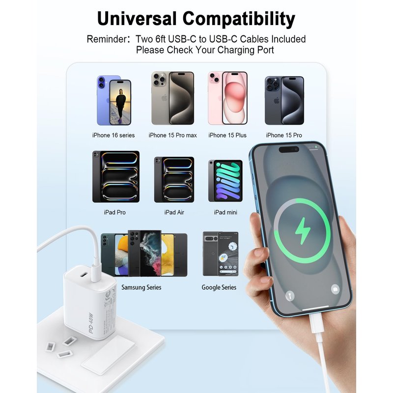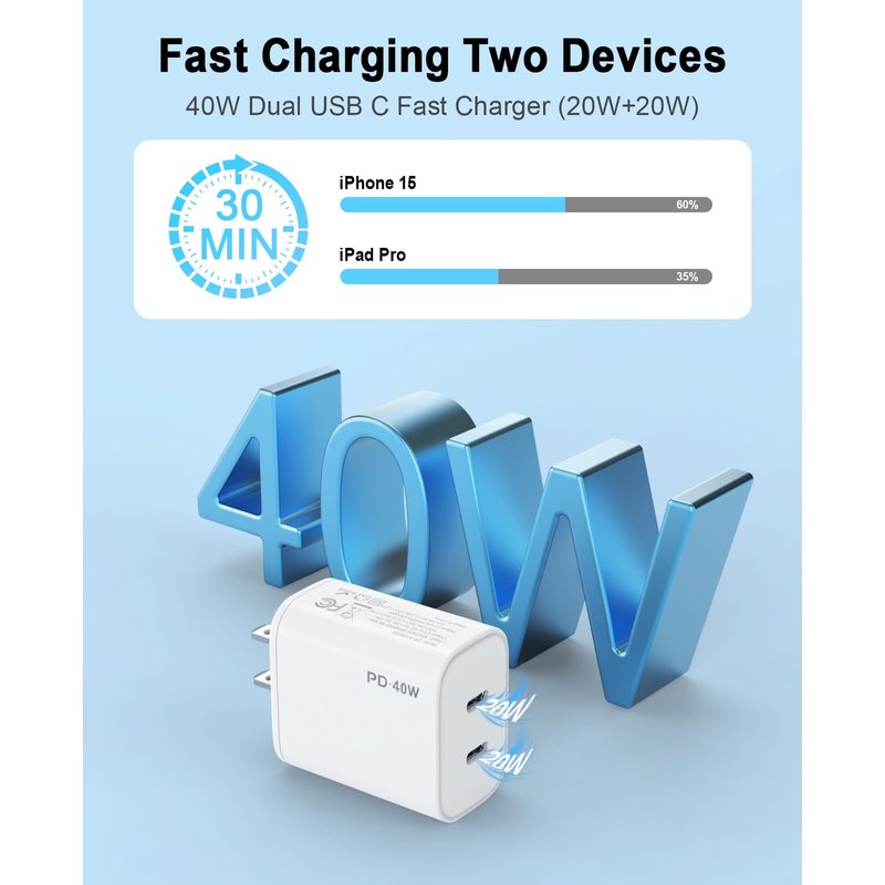 - 40W Fast Charging: With a combined output of 40W, this charger supports fast charging for compatible devices like the latest iPhones and iPads.Charges iPhone 16 15 up to 50% in just 30 minutes