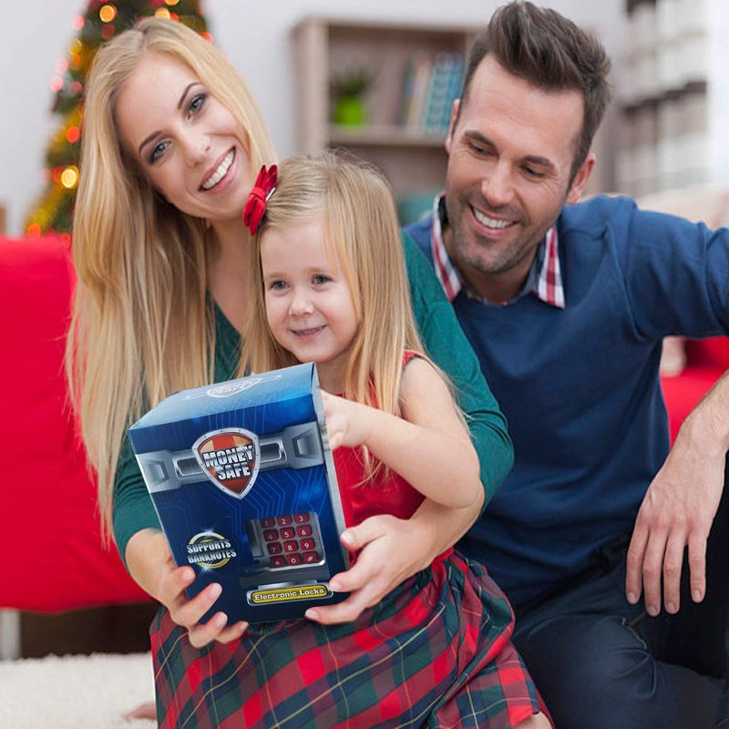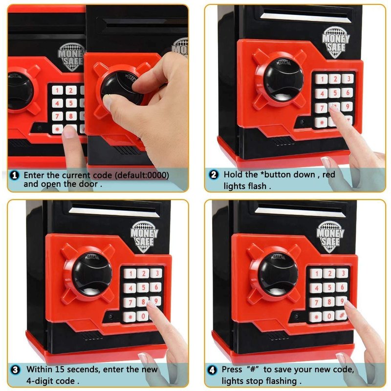 - Money Storage Method:① Put the banknotes on the reel opening of the kids safe bank, the atm piggy bank will be automatically rolled in; ② There is a coin slot on the top to put coins to save money.