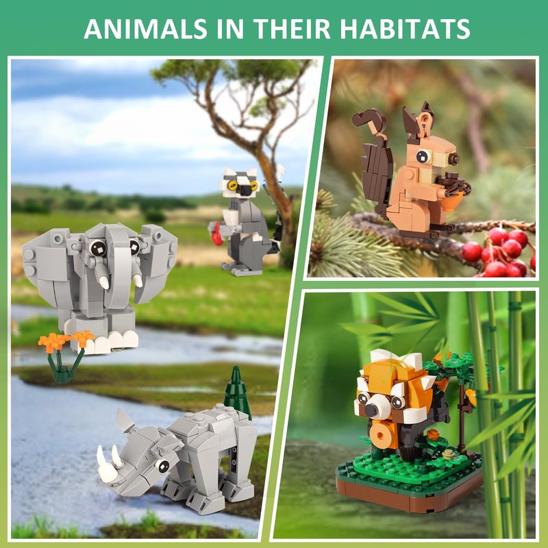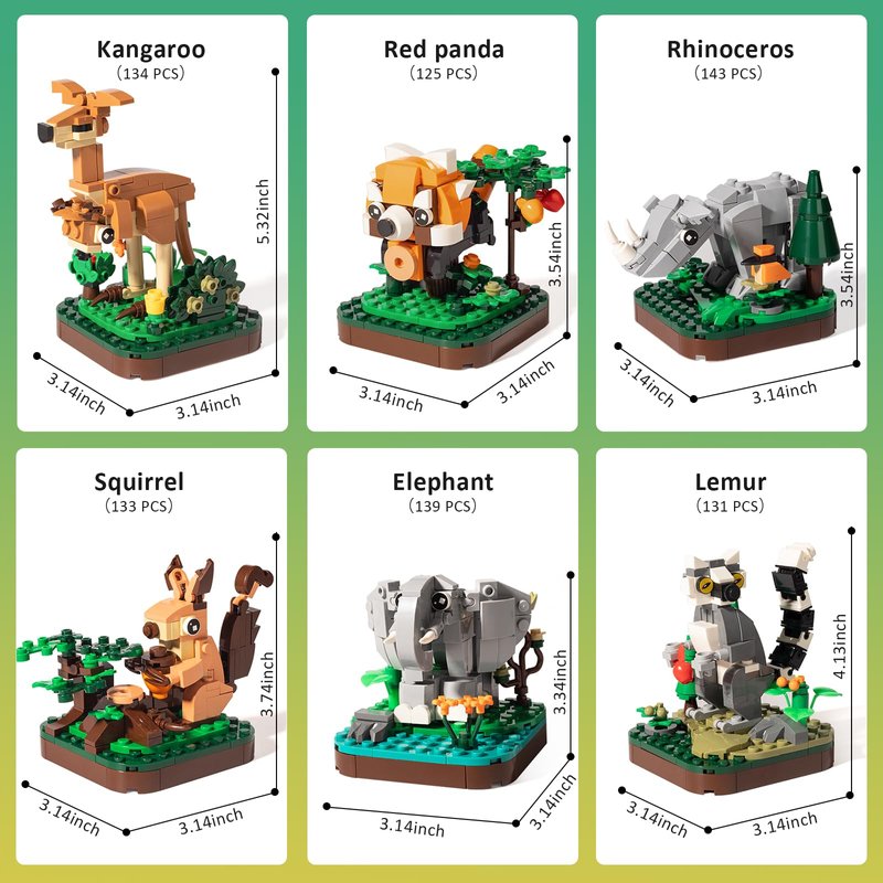This animals building sets includs 6Pack land animals,such elephant,kangaroo,red panda,rhinoceros,squirrel and lemur.This sets combines the joy of building with the mysterious nature.The animals collection will be displayed in your children's room.Suitable for boys and girls over 6 years old on school,easter, birthdays,christmas, thanksgiving.It's a perfect animal party favors Gifts for kids.