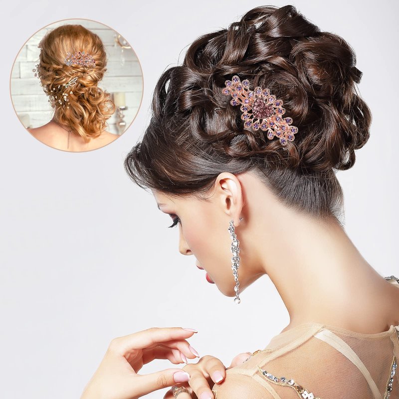 - Package Included: There are 4PCS Crystal Rhinestones Hair Clips in the package in different styles and colors, Purple and Blue Flower Heart, Purple and Multicolor Peacock, enough quantity and choice for your daily use, showing your hairstyles and matching your outfits