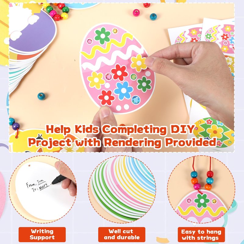 - Package includes:Easter egg craft kit for kids include 32 Easter egg bunny card in 8 styles, 250 colorful beads, 32 strings, over 400 stickers, 32 effect pictures, sufficient quantity to meet your DIY needs.