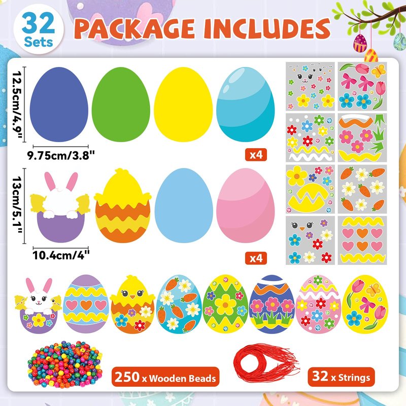 Qyeahkj 32 Set Easter Egg Craft Kit for Kids Easter Bunny Necklaces Beads Ornaments DIY Spring Sticker Arts Crafts Activities Make Your Own Hanging Decor Supplies for Home School Classroom Party Favor