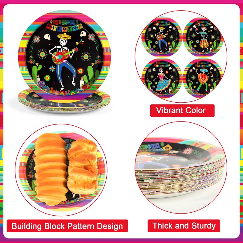 - Suitable size: With a diameter of 7 inches, these Mexican fiesta skull tableware provide proper space for food and it can serve for dessert, chips, taco, pan de muertos and any other snacks. The stylish Mexican themed party paper plates can meet various needs of party.