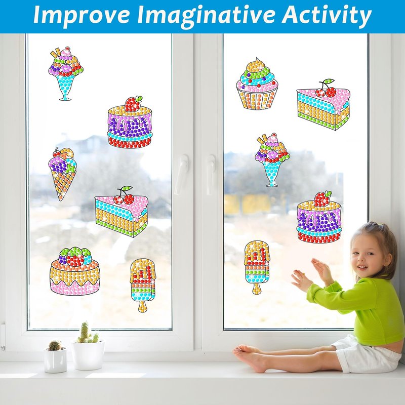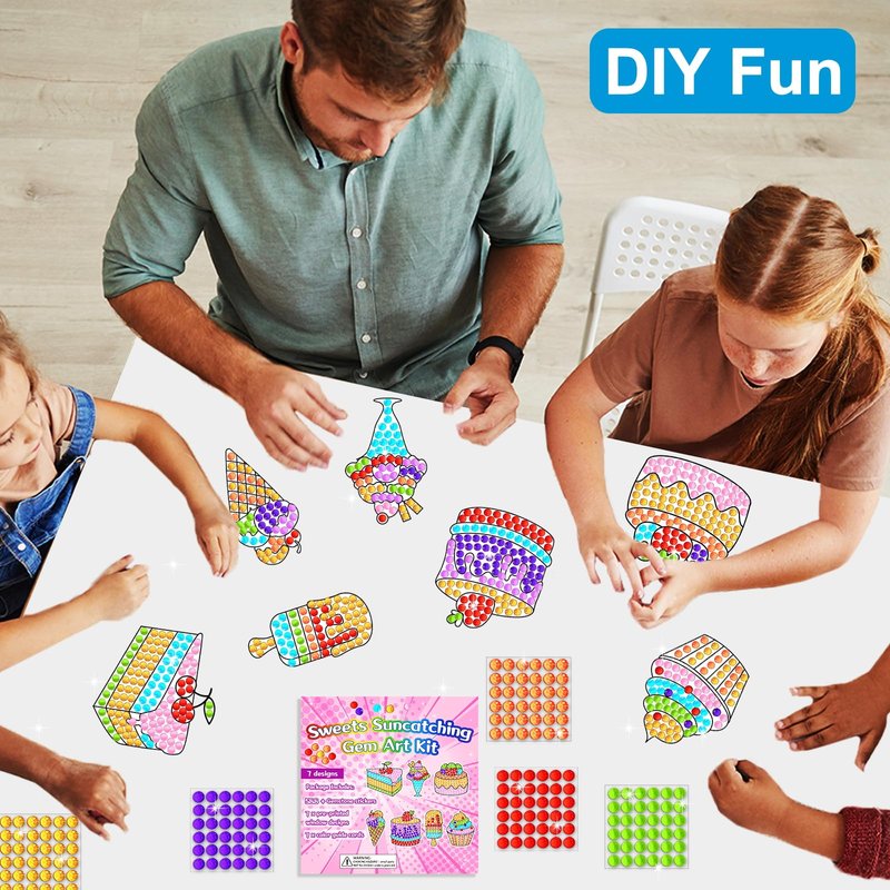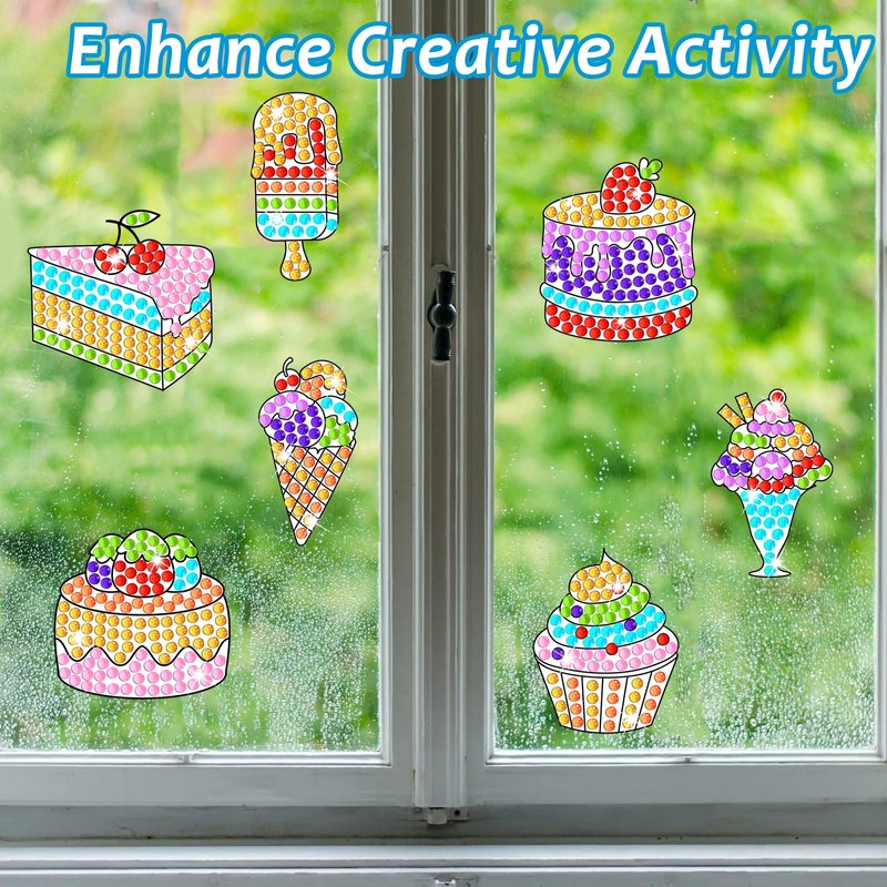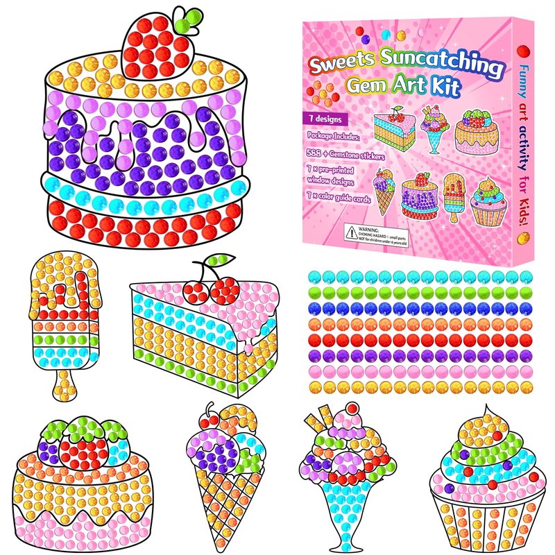 - Sweets diamond suncatcher crafts kit: You will get 7 printed designs, 7 color guides, and 588+ gemstone suncatching stickers; Creating Sweets crafts help develop kid's practical ability.