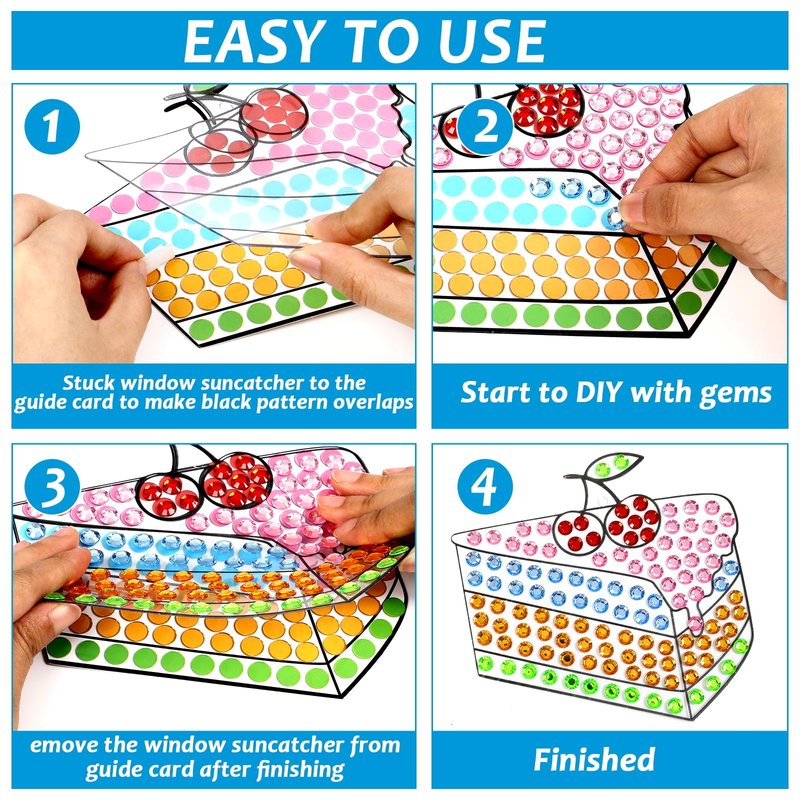 - Easy to use:1. Peel off protective film from sweets crafts suncatcher kits; 2. Place color guides under cute sweets and attach gemstones in matching colors; 3. Hang for decoration!