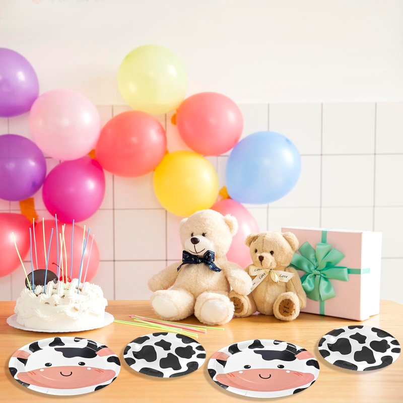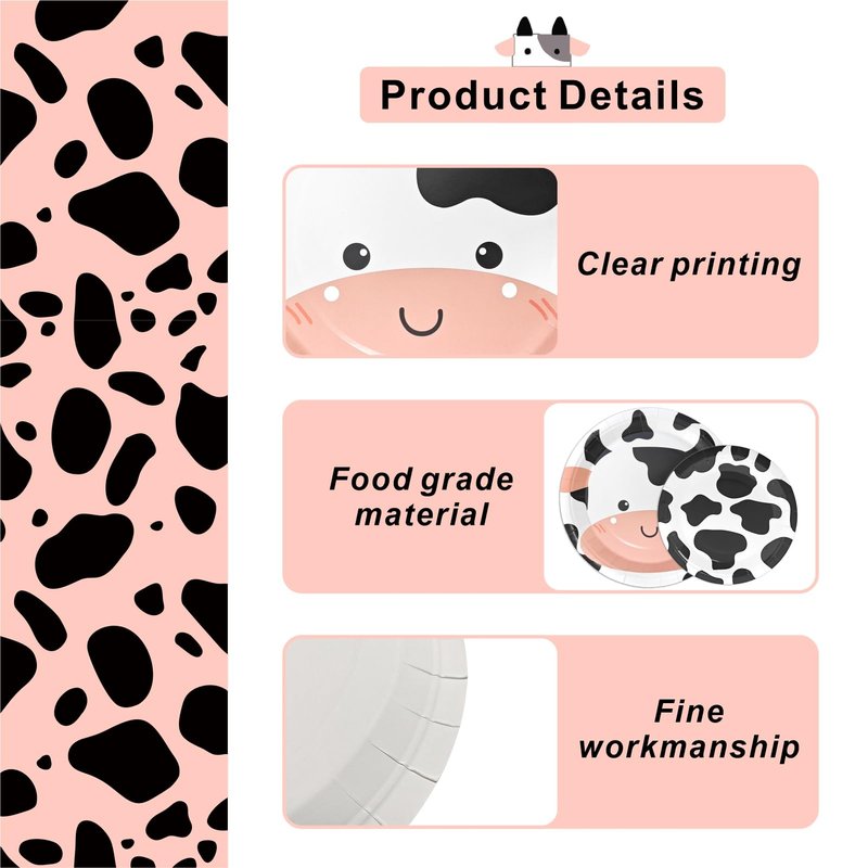- Cow Party Design - The cow print plates are perfect for any type of celebration. The cow pattern will make your party stand out and bring a cheerful atmosphere to your guests. Decorating your cow party with this tableware kit will make your event fun and memorable