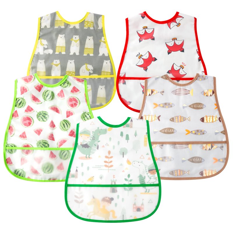 - Cartoon Pattern -- Package comes with 5pcs baby bibs with different cartoon and colorful pattern such as fox, fish, polar bear, watermelon, dinosaur. All of our baby bibs are professionally designed, not only can easily hold the containing spills, but also can be enough for any outfit. Suitable for baby's daily use.
