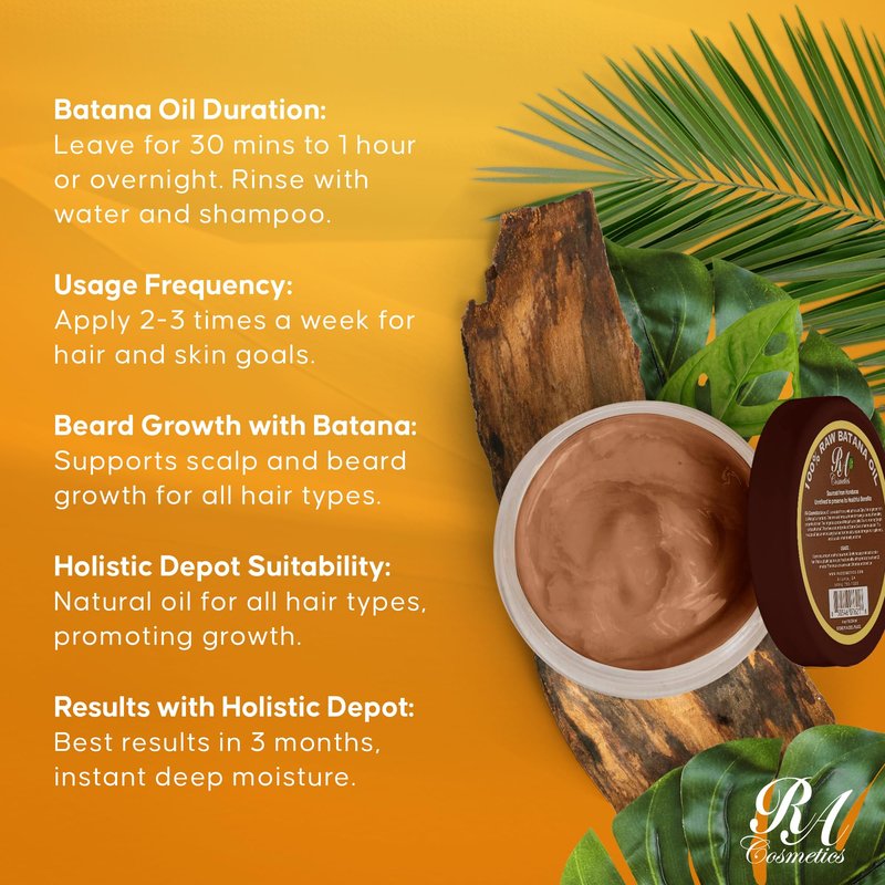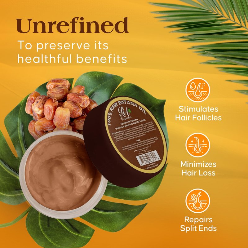 Introducing RA Cosmetics 100% Natural Batana Hair Oil, your gateway to unlocking the secret of luxurious, healthy hair. Sourced from the lush landscapes of Honduras, our Unrefined Batana Oil is a vitamin-packed butter extracted from the nut of the South American Palm Tree. For millennia, indigenous communities have harnessed its potent properties to strengthen and nourish their hair, and now you can too. Immerse your hair in the pure goodness of nature with our 100% natural Batana Oil, featuring an organic and nurturing formula. Crafted without any chemicals or additives, it delivers pure and wholesome care, leaving your hair thicker and more vibrant. Batana Oil, with its smooth, tangle-free formula, nourishes your roots, prevents split ends and knots, and provides all-day protection. Our natural solution ensures a thicker, fuller, and healthier mane, effectively controlling hair breakage and promoting overall hair health. Make Batana Oil a part of your daily routine as a versatile daily moisturizer to combat dryness and frizz as this exceptional oil deeply moisturizes your scalp and hair, enhancing vibrancy. With its lightweight yet deeply penetrating formula, it leaves your hair feeling soft, manageable, and naturally radiant all while shielding your hair's natural color by forming a protective barrier. Gently massage Batana Oil onto your scalp and hair and rinse after 20 minutes for indulgent, silky, salon-worthy locks in the comfort of your own space. Pamper yourself with the simplicity of application. Warm a small amount in the palm of your hand, gently massage onto your hair and scalp, cover with a plastic cap, and let the nourishing properties of Batana Oil penetrate. Rinse, shampoo, and condition for a transformative experience. Unleash the power of nature for hair that not only looks healthy but truly is. Elevate your hair care ritual today!