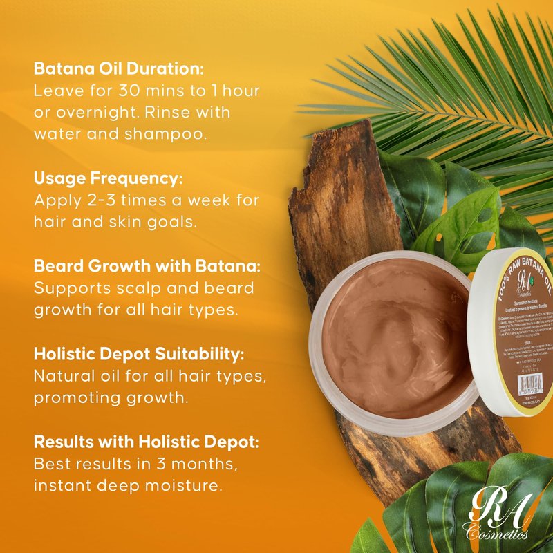 Introducing RA Cosmetics 100% Natural Batana Hair Oil, your gateway to unlocking the secret of luxurious, healthy hair. Sourced from the lush landscapes of Honduras, our Unrefined Batana Oil is a vitamin-packed butter extracted from the nut of the South American Palm Tree. For millennia, indigenous communities have harnessed its potent properties to strengthen and nourish their hair, and now you can too. Immerse your hair in the pure goodness of nature with our 100% natural Batana Oil, featuring an organic and nurturing formula. Crafted without any chemicals or additives, it delivers pure and wholesome care, leaving your hair thicker and more vibrant. Batana Oil, with its smooth, tangle-free formula, nourishes your roots, prevents split ends and knots, and provides all-day protection. Our natural solution ensures a thicker, fuller, and healthier mane, effectively controlling hair breakage and promoting overall hair health. Make Batana Oil a part of your daily routine as a versatile daily moisturizer to combat dryness and frizz as this exceptional oil deeply moisturizes your scalp and hair, enhancing vibrancy. With its lightweight yet deeply penetrating formula, it leaves your hair feeling soft, manageable, and naturally radiant all while shielding your hair's natural color by forming a protective barrier. Gently massage Batana Oil onto your scalp and hair and rinse after 20 minutes for indulgent, silky, salon-worthy locks in the comfort of your own space. Pamper yourself with the simplicity of application. Warm a small amount in the palm of your hand, gently massage onto your hair and scalp, cover with a plastic cap, and let the nourishing properties of Batana Oil penetrate. Rinse, shampoo, and condition for a transformative experience. Unleash the power of nature for hair that not only looks healthy but truly is. Elevate your hair care ritual today!