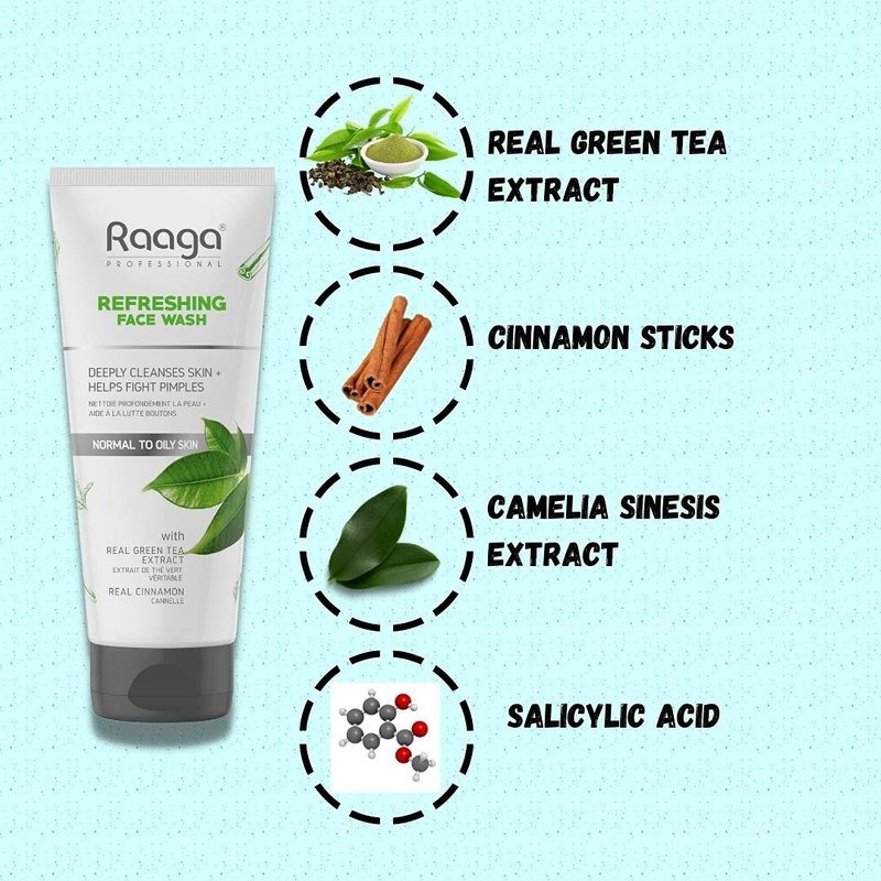 Raaga Professional Refreshing Face Wash 2.7 F1 Oz (80ml) | Green Tea Extract and Cinnamon Extract | Facial Cleanser for Men and Women | Facewash for Acne, Oily, & Normal to Dry Skin