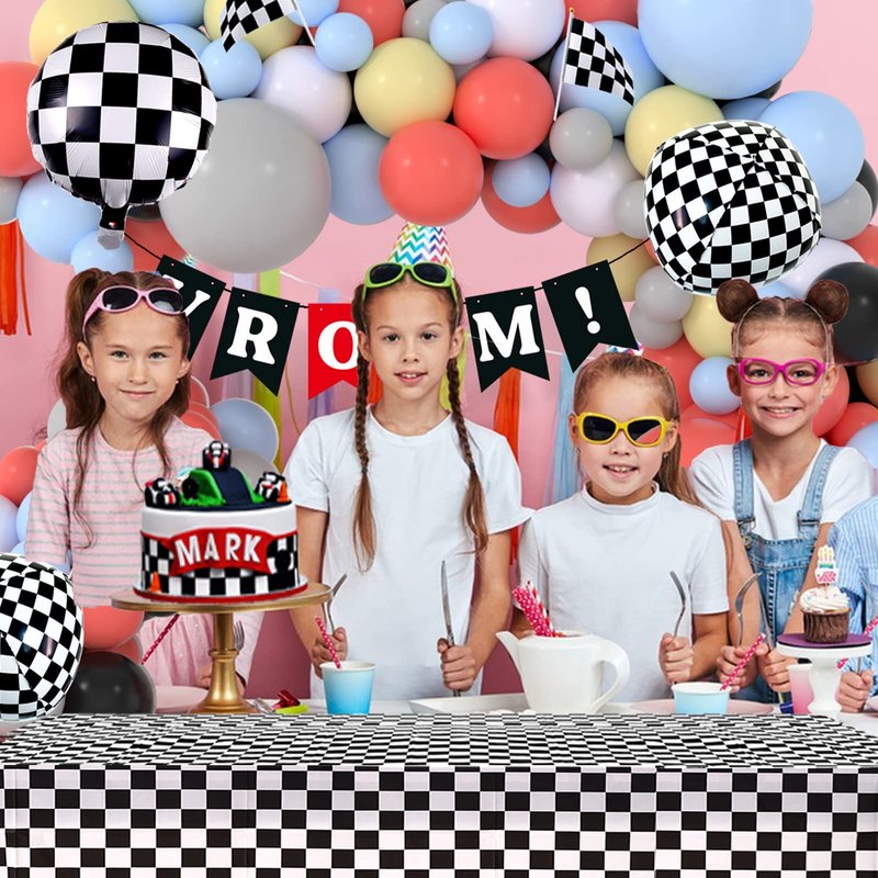 - Racing Birthday Party Decorations: Racing balloon garland with black white checkered party banner, tablecloth and flags, would be a great idea for race car theme birthday party. They will bring you a fun and memorable birthday celebration.