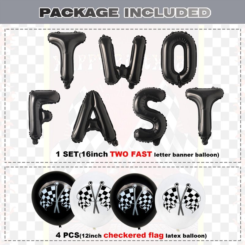 [Package included] :1 pcs 40 Inch foil mylar racetrack black number balloon 2,2 pcs 18 Inch black and white chequered round balloons,1 set 16 inch(TWO FAST) letter banner balloon,4 pcs 12 inch checkered flag latex balloons,4 pcs star foil balloons (2 red,2 black ),1 pcs ribbon,1 pcs straw.