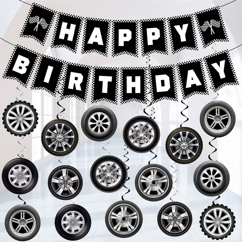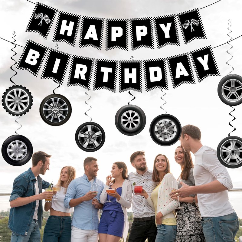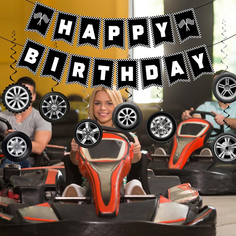 Race Car Birthday Party Decorations, Race Car Party Decorations Includes Happy Birthday Banner and Wheel Hanging Swirls, Race Car Theme Party Birthday Party Supplies