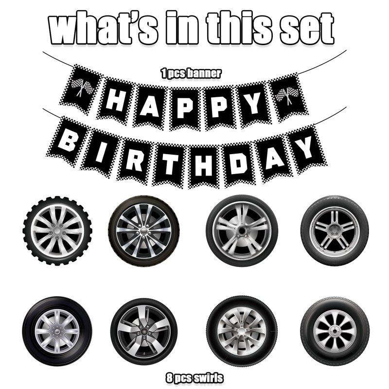 - 【Package Included】:Race car birthday decorations includes 1pcs happy birthday banner and 16pcs race car theme cardstock with 8 different wheel styles and 16pcs foil hanging swirls