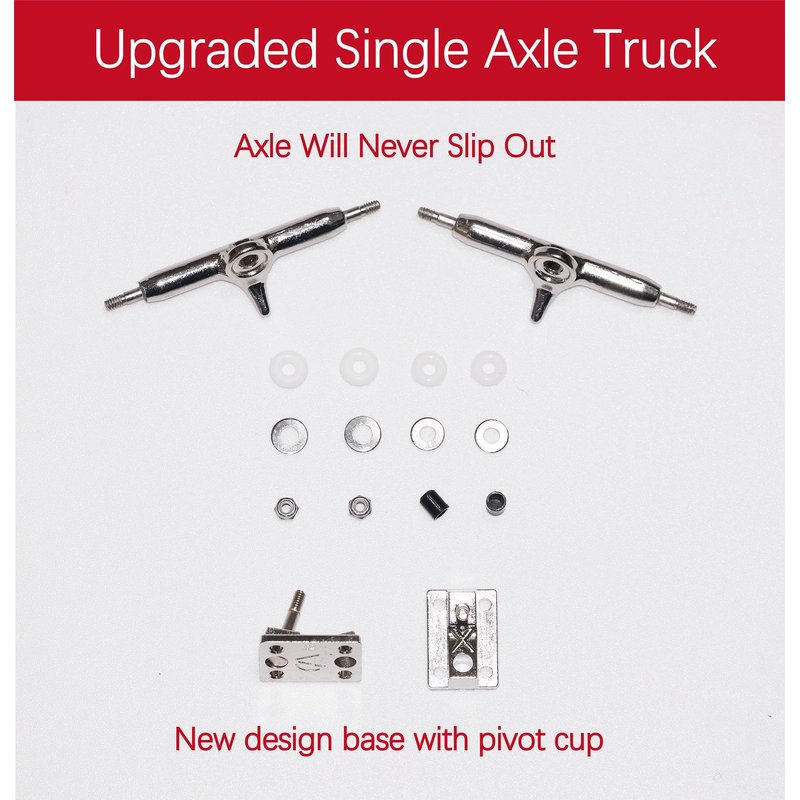 - Fingerboard Trucks - The new base is bigger and thicker with a new geometry and a proper pivot cup, axle and hanger form a whole, which ensures that axle never slides out