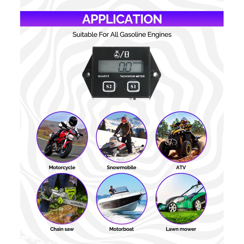 - [Applicable] The waterproof universal hour meter is suitable for all two-stroke and four stroke gasoline engines. Widely used in motorcycles, ATVs, ships, outboard engines, lawn mowers, UTVs, snow motorcycles, repair bicycles, generators, tractors, scooters, golf carts, light motorcycles, etc.