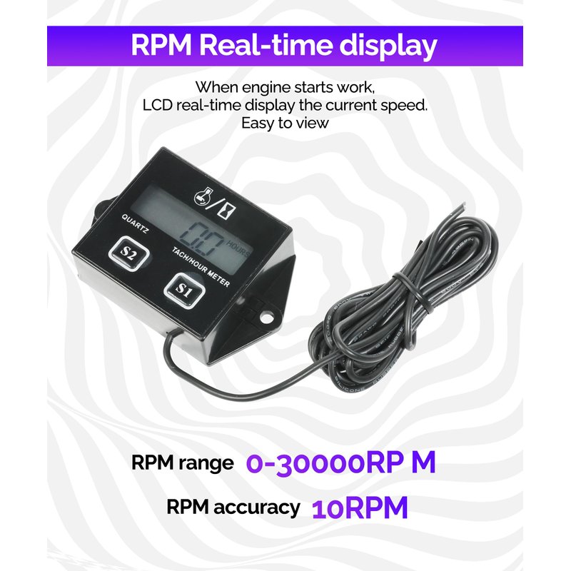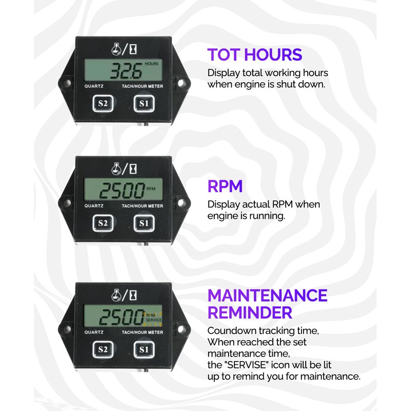 - [Two In One Multifunctional] includes two functions: a tachometer and an hour meter, which can display engine speed and operating hours. It can help you track engine operating time and record engine speed to improve work efficiency and save time. The hourly reading is as high as 99999H.