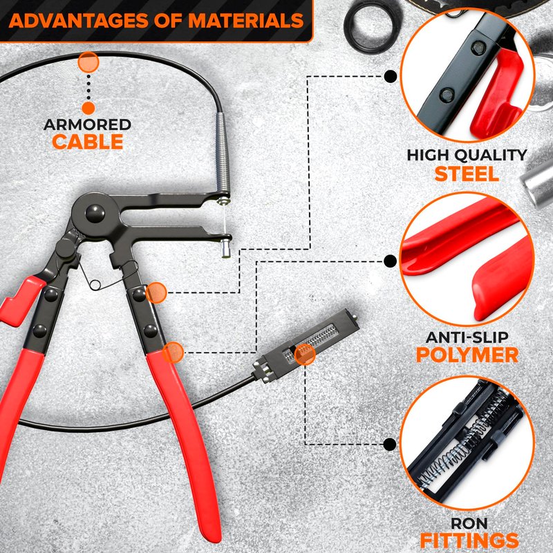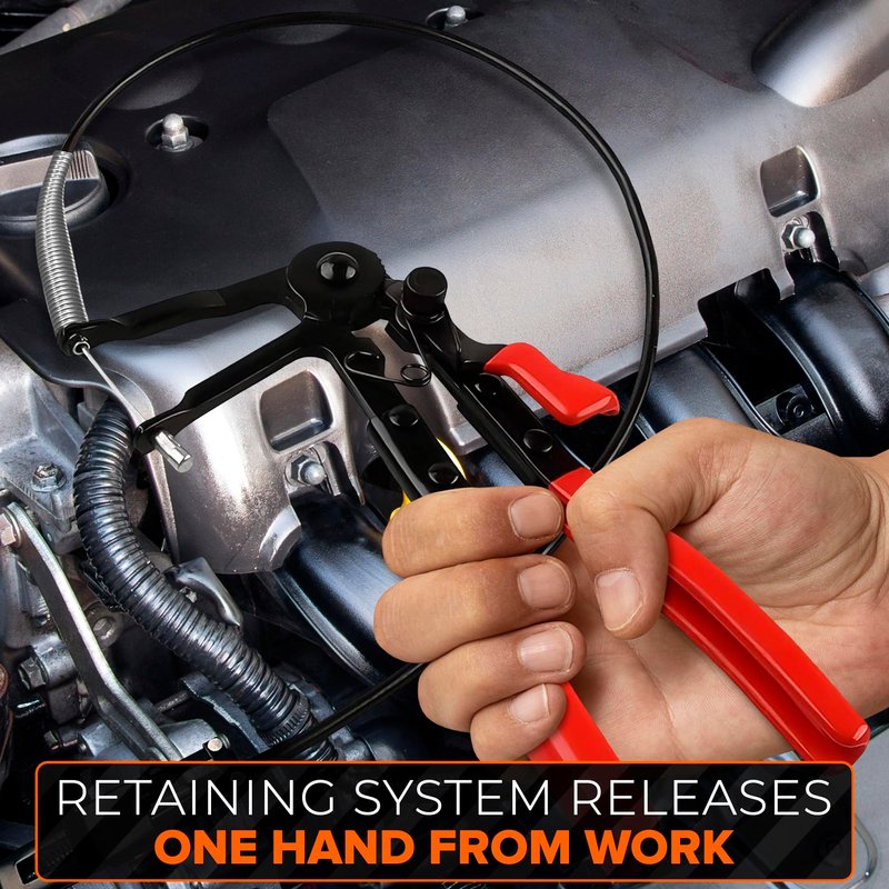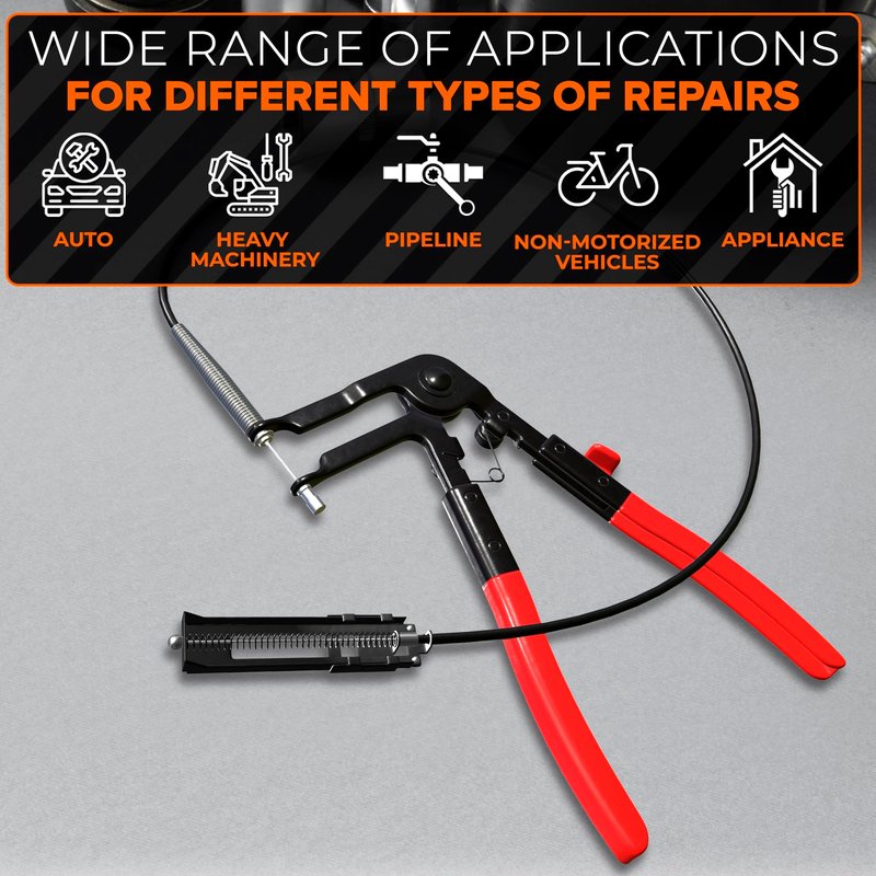 Hose Clamp Pliars with 24 Inches Flexible Cable Pinch off pliers tool to maintenance replacing or repairing of a part of car or water pipe you need a reliable plier tool to remove a hose pliers automotive clamp. These adjustable cable clips clamps with a flexible cable that allows for flexible positioning and extended reach where other models cannot get to making them ideal for work in tight and confined spaces. The pinch point tool also features a locking mechanism which holds the clamp in the open position to enable the user to remove and install clamps with ease. These cable operated hose clamp pliers can also be a good gift for a man, especially if his profession is a plumber or mechanic. Specifications: Material: Carbon steel Pliers Size: 3.74 x 8.3 inches (W x L) Color: Red and black Package Included: 1 x Hose clamp pliers tool Wide Application: These hose clamp tool pliers can loose hose clamps on cars, remove factory spring hose clamps, factory GM clamps, coolant or radiator hoses. hose clamp pliers set allows technicians to access flat hose clamps located in hard-to-reach areas. Easy To Use: Practical flexible hose pipe tongs of hose clamp pliers automotive make the removal and installation of the clip easier, The non-slip handles of hose pinch off pliers assures steady grip and decrease hand fatigue during use, The small size and lightweight make flexible clamp easy to carry, Lock Function: The hose clamp pliers has a ratchet lock that will hold the clamp compressed which can make it a one handed affair. The rubber hose pliers locking mechanism to remove and install metal and plastic self-tightening clips with ease while.