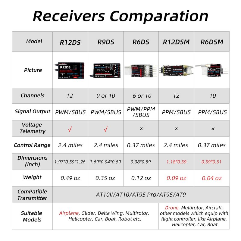 - 6/10 Channels: Support PWM/PPM/SBUS signal output, ideal for most aircraft. Make sure menu SYSTEM CH selection is 10CH when it works with AT10/AT10II transmitter, or it won't work well.