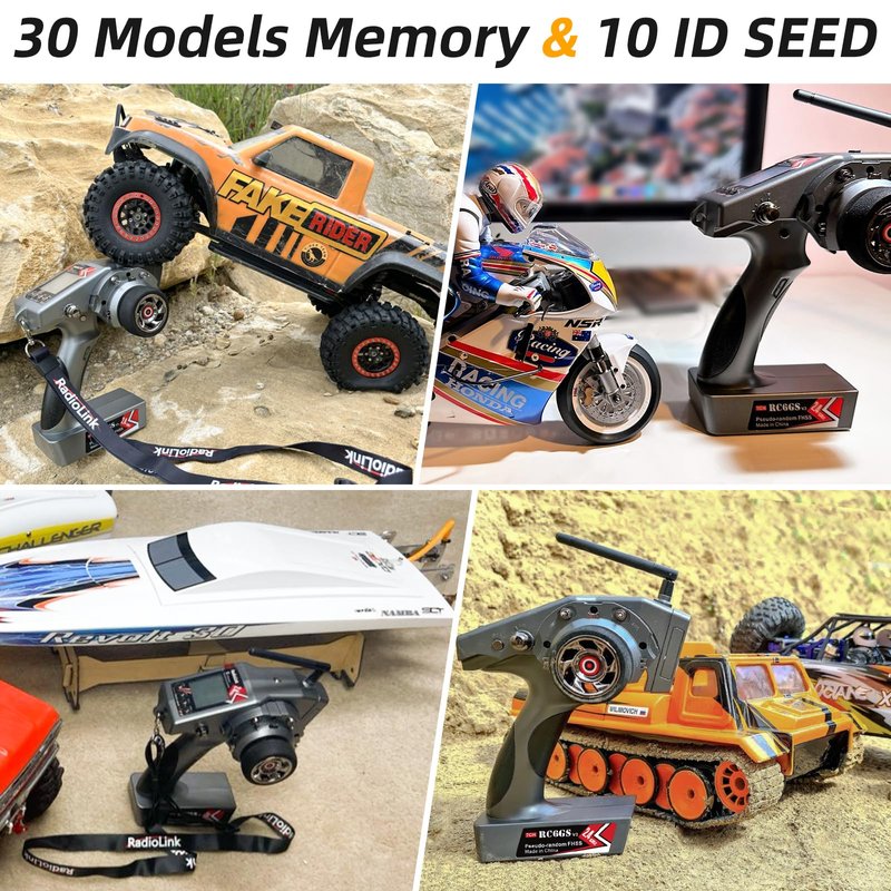 - APPLY TO VEHICLES & BOATS - with 30 models storage and each model can be set up alarming and named separately, ID SEED function support assigns one of the vehicles running when they are powered on. RC6GS V3 can work with R8FG/R8FGH/R7FG/R6FG/R6F/R4FGM/R8EF receivers.