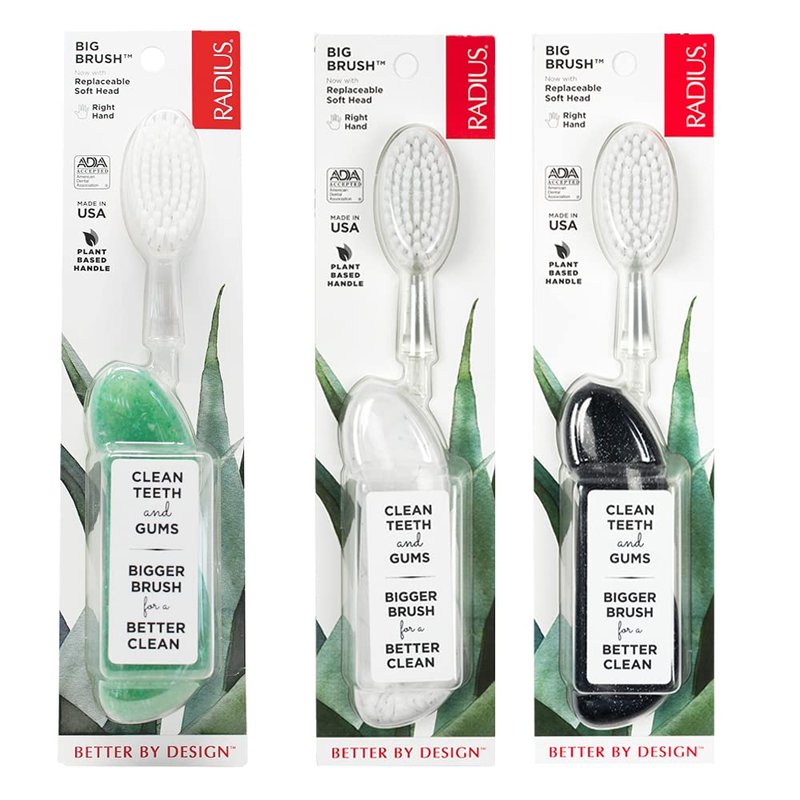- ERGONOMIC GRIP: Our award winning handle feels so comfortable for righties and lefties it will be hard to stop brushing. A sustainable design that works. From the plant-based handle sourced from renewable timber to the replaceable head to the vegetable-based nylon bristles, the RADIUS Big Brush is earth-friendly, 100% petroleum-free and 100% effective in keeping your smile sparkling.
