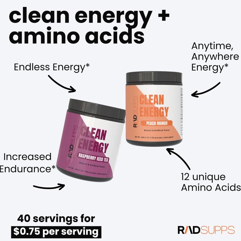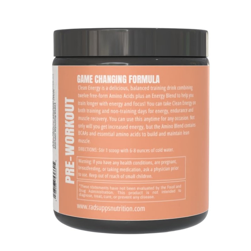 Clean Energy is a delicious & balanced natural energy powder that combines 12 free-form Amino Acids plus an energy blend to help you train harder and longer with improved energy and focus. Clean Energy is what we like to call the Anytime, Anywhere formula because you can take it on both training and non training days for energy, endurance and muscle recovery. Clean Energy is a preworkout for men and pre workout powder for women that combines essential amino acids with a clean green tea energy blend. Loaded with powerful BCAAs and essential amino acids, our advanced formula provides the energy boost you need to conquer even the toughest workouts. Whether youre lifting weights, running marathons, or engaging in high-intensity interval training, RADSUPPS delivers unparalleled energy and endurance to help you achieve your fitness goals.