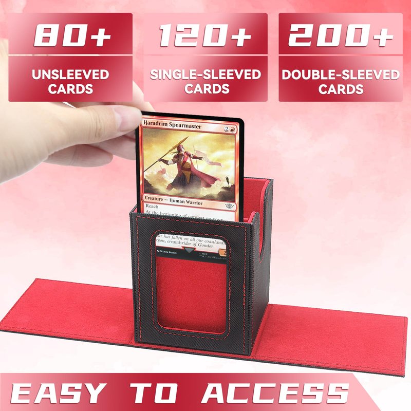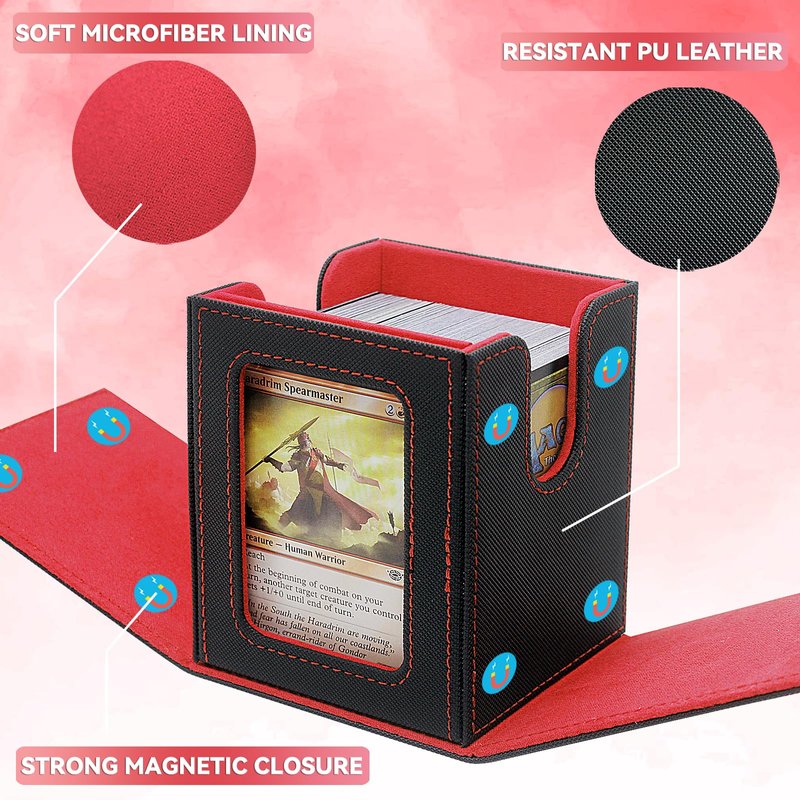 - 【SECURE DESIGN】Tight fitting, designed to prevent the collapse of valuable cards, powerful 4 magnets keep the card safe during transportation. The trading card storage can be tightly closed even when fully loaded and turned over. There is a window on the side of the card box to place your commander or avatar, ensuring that you quickly identify the groups of cards in each deck box.