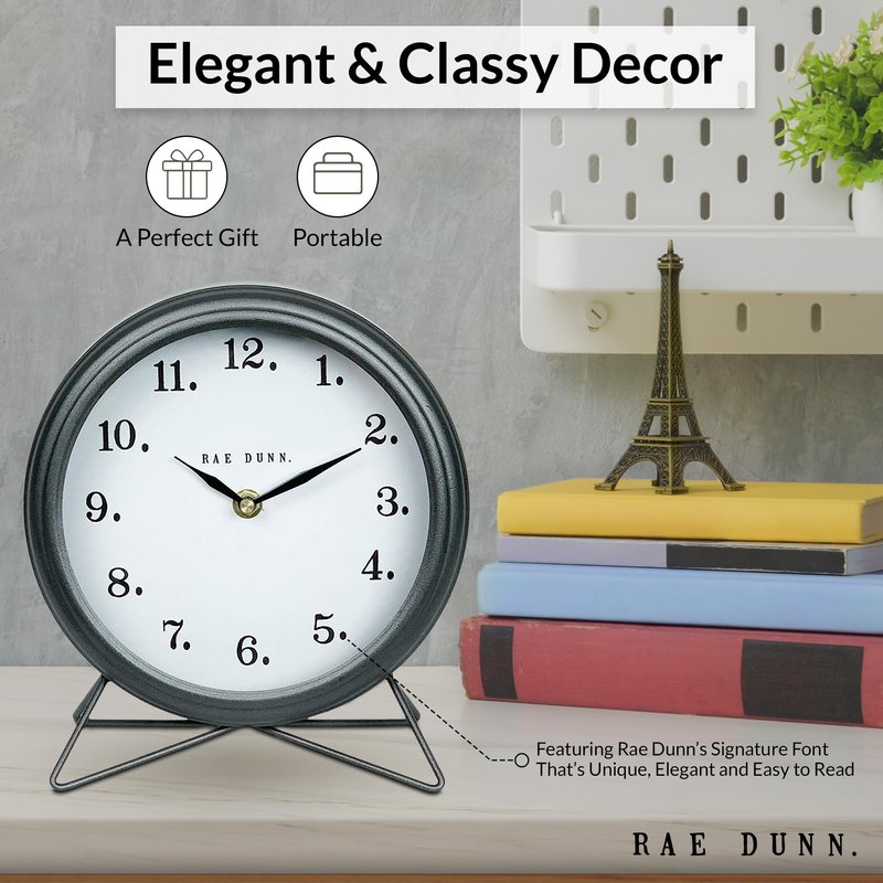 Rae Dunn Desk Clock - Battery Operated Round Modern Rustic Design, Top Handle for Bedroom, Office, Kitchen - Small Classic Analog Display - Chic Home Décor for Desktop Table, Countertop