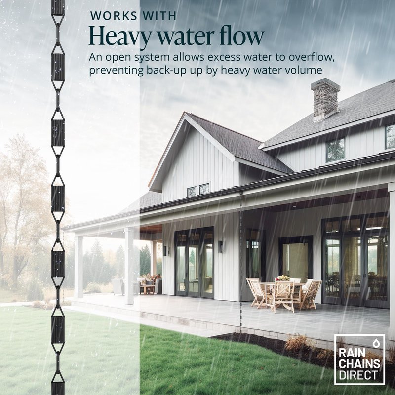 - Unrestricted Water Flow - The open-flow design of the gutter chain downspout allows water to effortlessly cascade down the chain without fear of backing up, even in heavy rain.