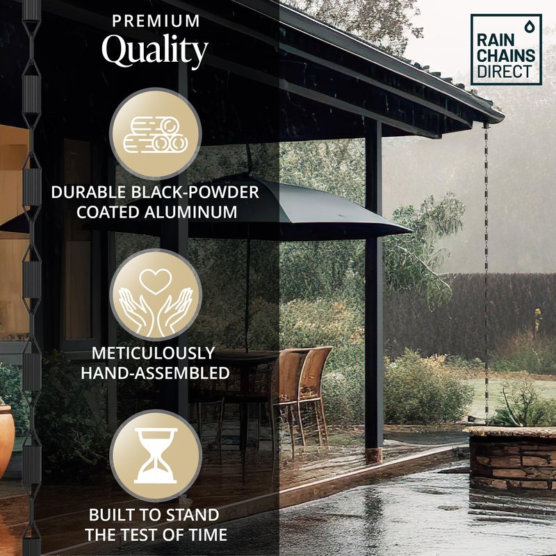 - Exceptional Durability - Crafted from milled aluminum and finished with a durable black powder-coating, our rain chains for gutters are meticulously hand-assembled, promising a lifetime of beauty and resilience.