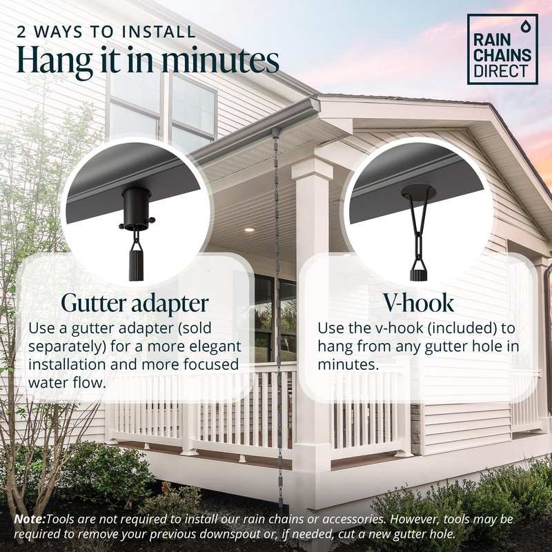 - Install in a Snap - No need to be an expert. Easily swap your rain chains for downspouts using the supplied hanging hook. Our rain chains for outside are compatible with any standard gutter hole. Optional gutter installer sold separately.