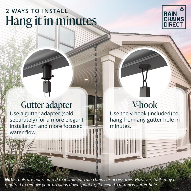 - Install in a Snap - No need to be an expert. Easily swap your rain chains for downspouts using the supplied hanging hook. Our rain chains for outside are compatible with any standard gutter hole. Optional gutter installer sold separately.