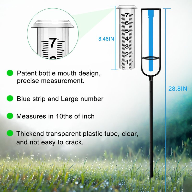 - 【Upgraded accurate rain gauge】We found that most rain gauges on the market do not measure accurately due to incorrect design of the tube mouth which leads to excessive collection of rainwater. We have improved the design of the tube mouth and make the area of rainwater collection at the tube mouth the same as the tube body(patented design), so that no excess rainwater enters the rain gauge tube, and the rainfall measurement value is accurate.