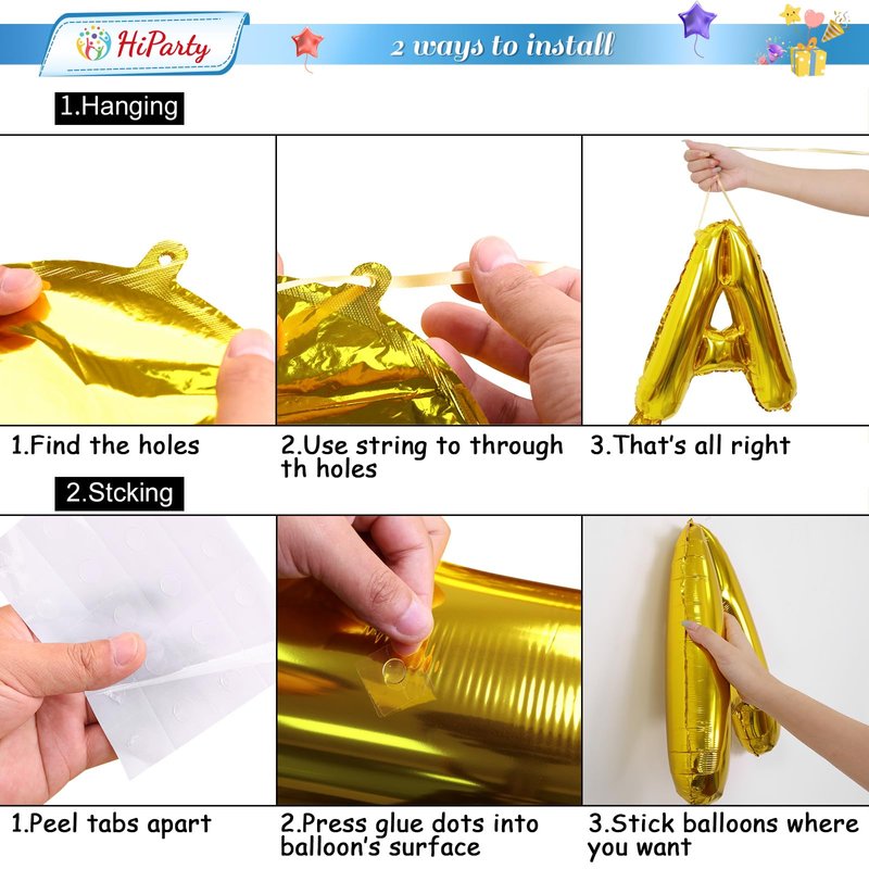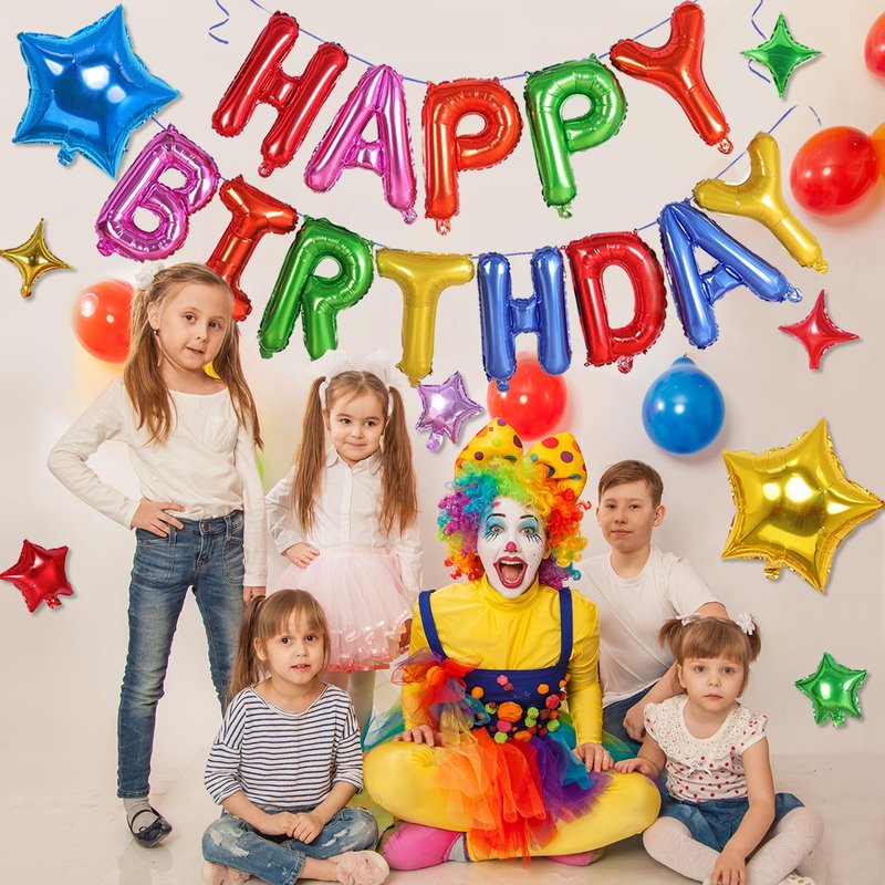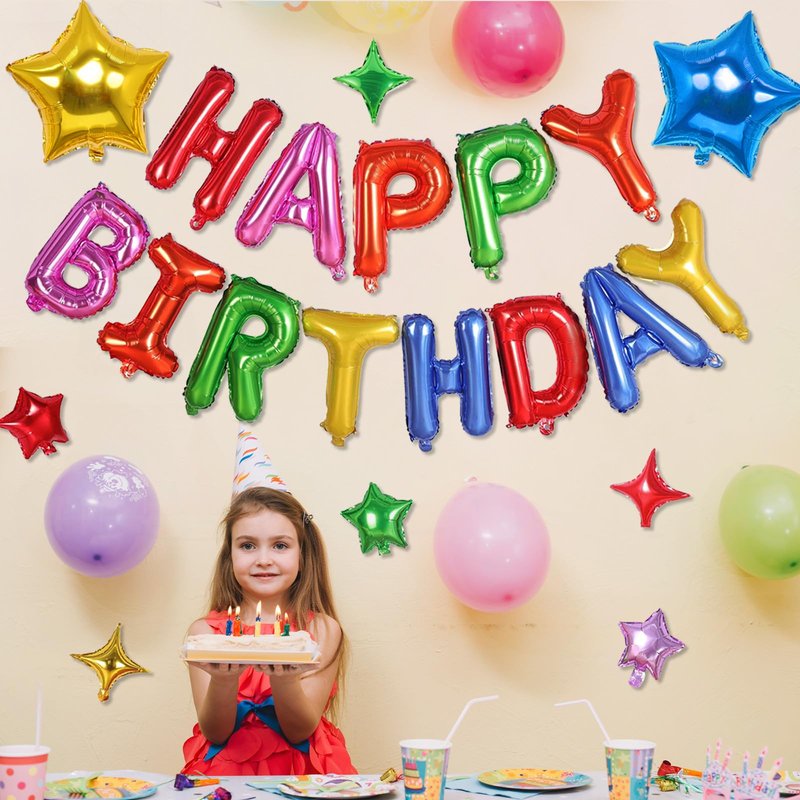 - 🍰【What You Get】①Happy Birthday letters x13pcs(16in) ②Big star balloon x2pcs(18in) ③Four-pointed star x3pcs (10in) ④Five-pointed star x3pcs (10in) ⑤Ribbon x1pcs (33ft) ⑥Plastic straw x1pc(4.65 in) ⑦Double-sided glue dot (20dot) ⑧1pc needle