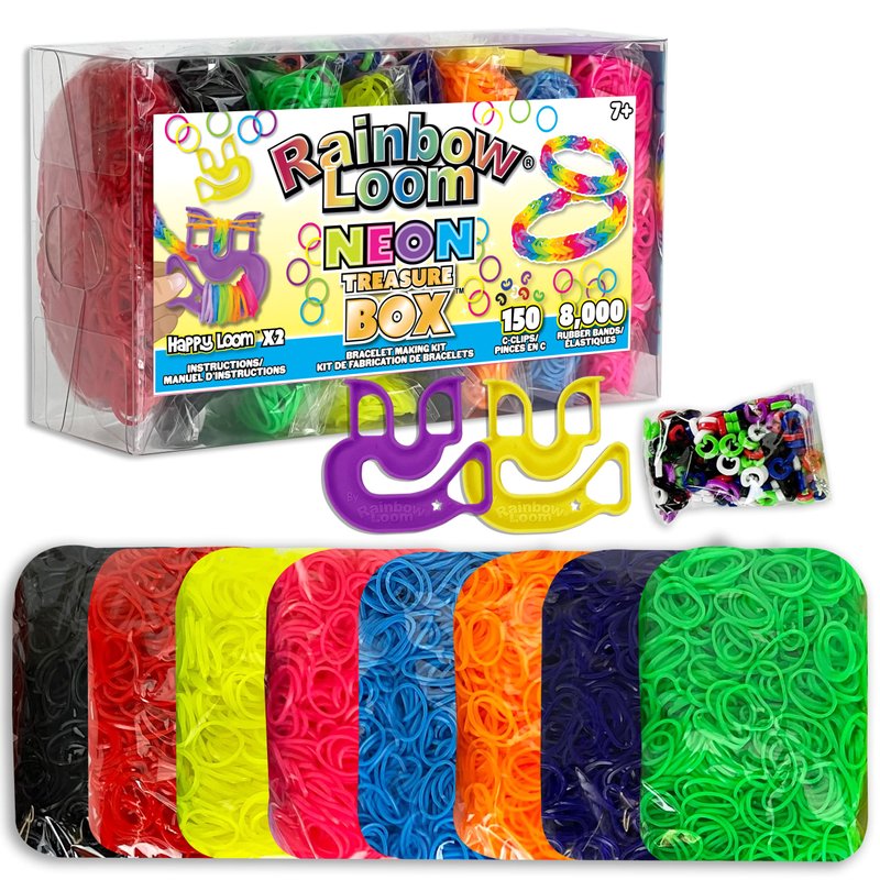 - HUGE 8000+ PIECE KIT: The Rainbow Loom Treasure Box Neon Edition features 8,000 neon rubber bands, 2 Happy Looms, and 150 colored C-clips. Enjoy hours of endless fun with 8 different colors of sparkle bands to work with!