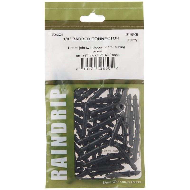 Raindrip 312050B Drip Irrigation Fittings Single Barbed Coupling Connectors, 1/4-Inch, 50 Per Bag, for Trees, Shrubs, Black