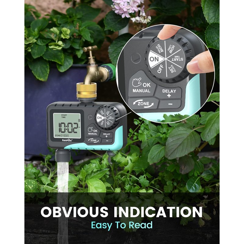 - 8 HOURS MANUAL/4 HOURS AUTO MODE-- Hose timers for watering is upgraded with 3 separate manual/auto modes: ZONE 1/ZONE 2/ Both ZONE, which supports individual or simultaneous use without interfering. The manual watering time is from 1min to 8hrs and the automatic watering time is from 1 min to 4 hrs.Oversized features for ease of use.
