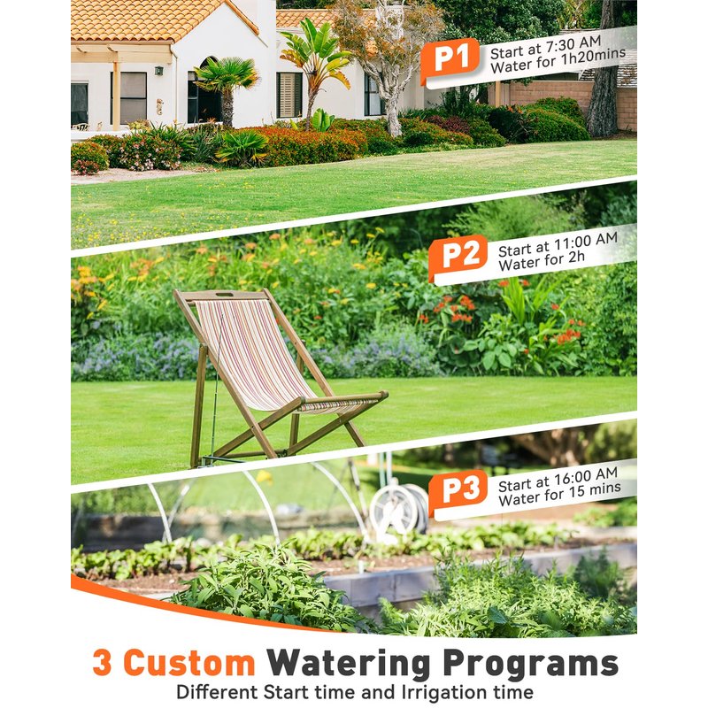- 【3 Custom Watering Programs】 >> The hose timer has 3 individual programs per day, each program can set its own start time (12h or 24h mode) and watering duration (1min-3h59min). You can choose to water at the right time. It will fully meet your different watering needs.