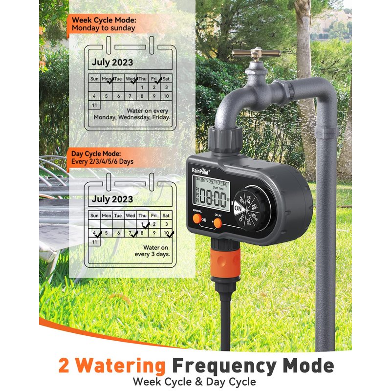 - 【3 Watering Frequency Modes】 >> This irrigation timer has Week Cycle Mode (from Monday to Sunday) and Day Cycle Mode (every 2/3/4/5/6 days) and Specific Day watering Mode, allows you to set the suitable watering schedual in compliance with local regulations. You can travel freely and easily without worrying about your garden watering system.