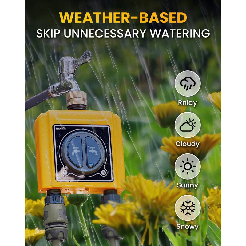 - RAIN DELAY & MANUAL WATERING: The wifi sprinkler timer can automatically skip the watering schedule on rainy and snowy days based on the latest local forecasts. And when you need temporary watering, you can turn on manual watering with one click without affecting the watering schedule you set.