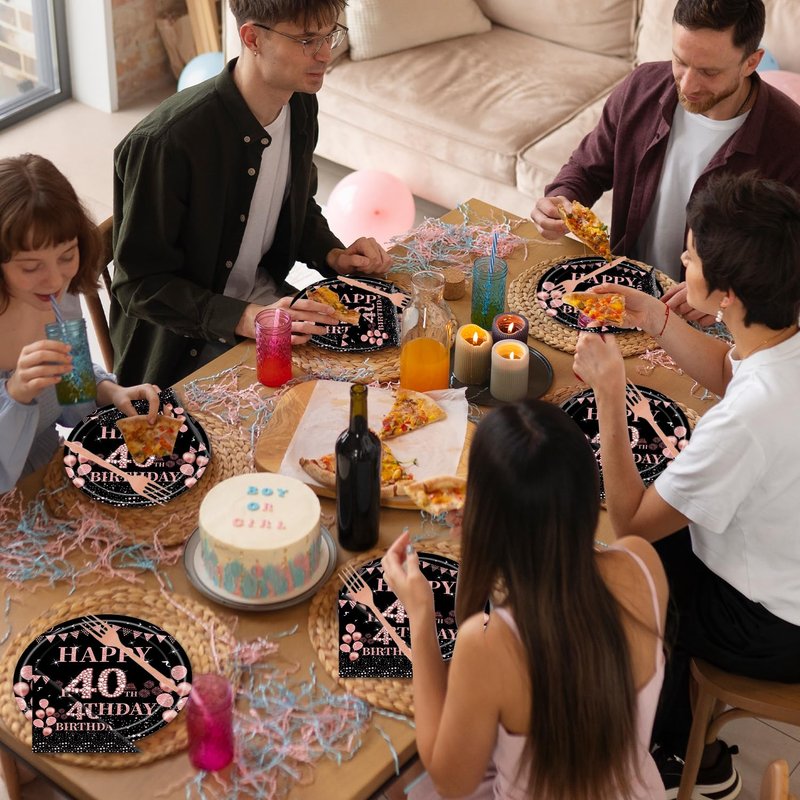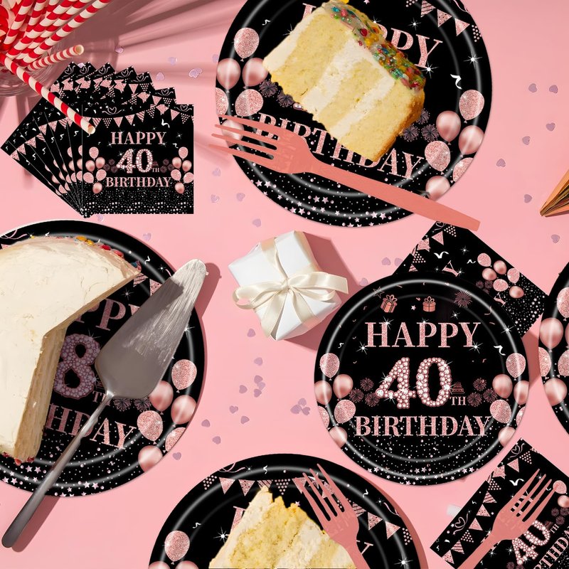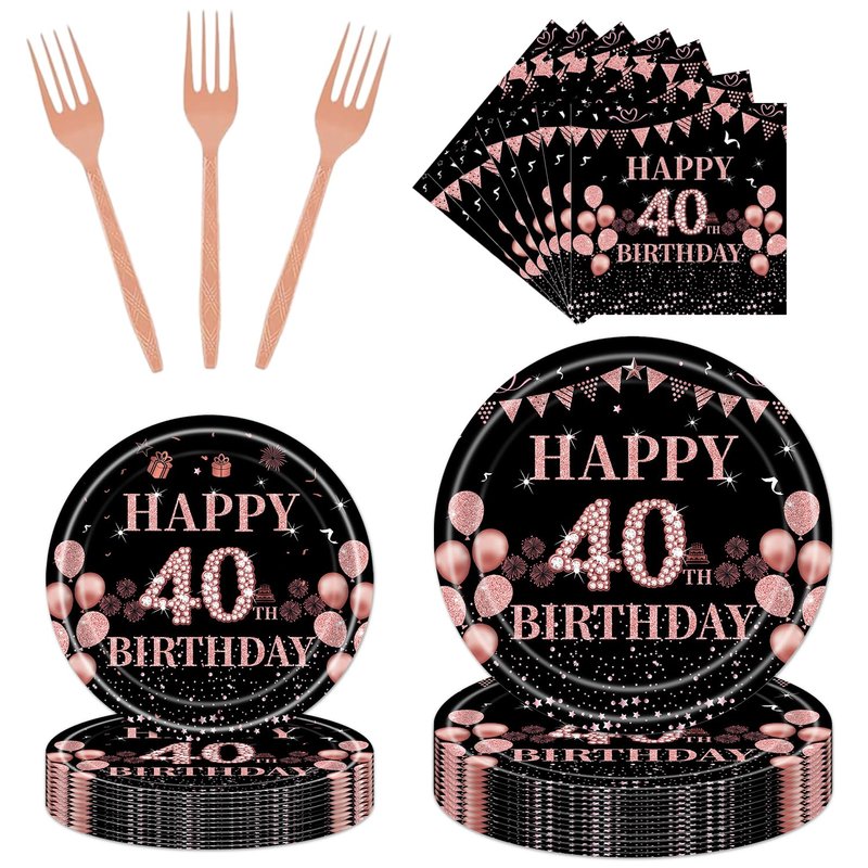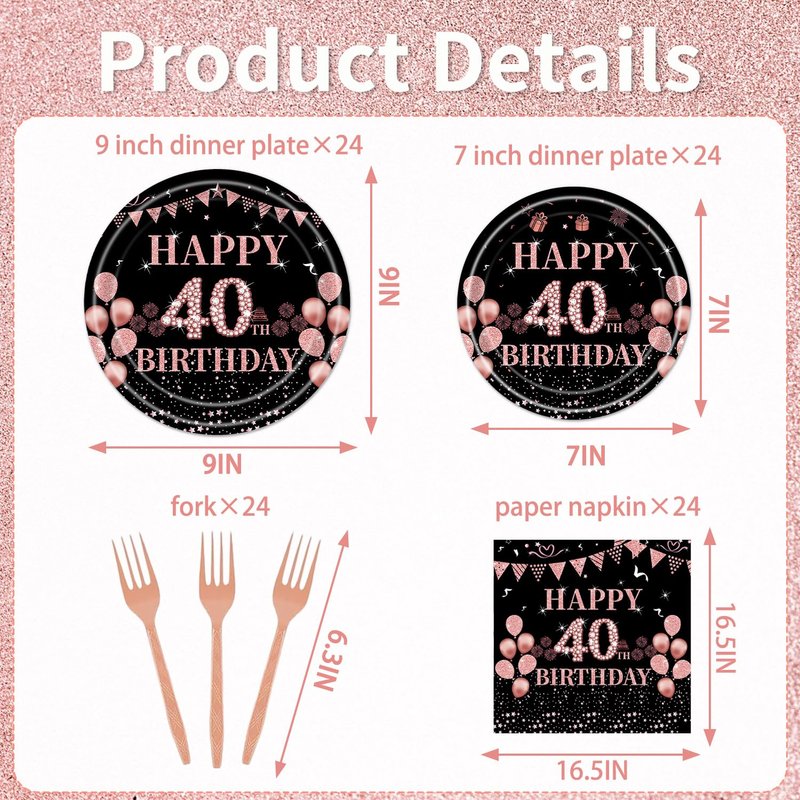 - 40th Birthday Party Tableware: The birthday-themed tableware set has 96 pcs in total, including rose gold dinner plates, dessert plates, paper towels, and forks, 24pieces each. Rose gold themed tableware brings joy to your birthday party.